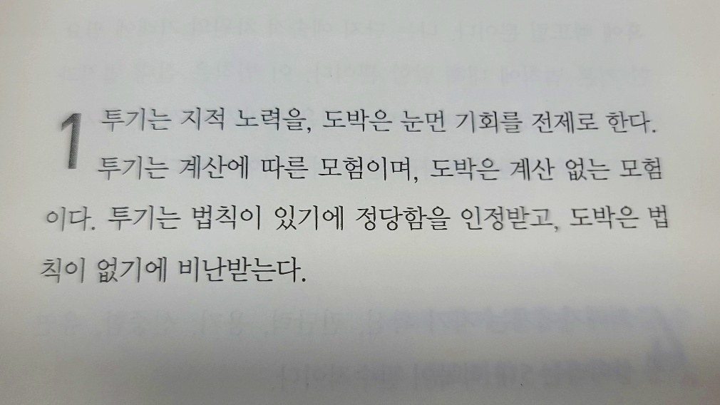 투자와 투기와 도박의 정의를 내린 내용으로 주식시장에서 자신이 투자를 하는지, 투기를 하는지, 도박을 하는지에 대하여 생각하게 만드는 부분이다. 현재 투자 방식이 잘못되었다면 모든것을 멈추고 처음으로 돌아가 투자와 투기와 도박의 정의에서 다시 시작하자는 내용이다. 오랜 시간이 흘러 지금봐도 멋있는 말이다.