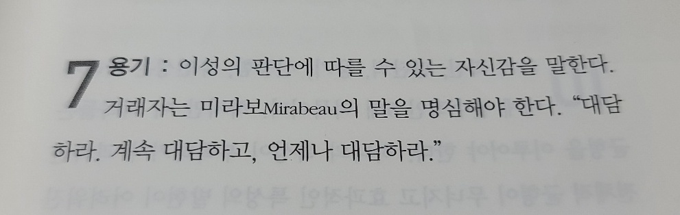 돈을 잃는 것은 조금 잃는 것이다. 명예를 잃는 것은 조금 더 잃는 것이다. 하지만 자신감을 잃는 것은 모든 것을 잃는 것이다 라는 명언을 어느 책에서 읽은 적이있다. 자신감과 자존감에 대하여 용기를 항상 가지라는 말로 자만과는 뜻이 전혀 다르니 항상 자신을 체크해서 자신감 있고 진취적인 마인드 컨트롤을 하라는 내용이다. 단 이성적, 직관적 냉철함이 필요하다.