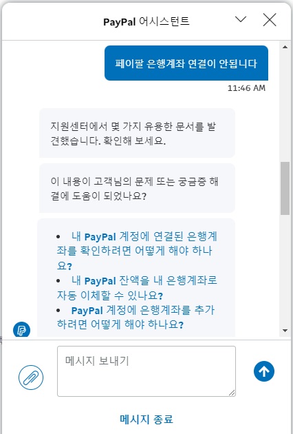 해답은 고객센터와 통화하는 방법이다. 설명을 보고 차근차근 따라하면 목소리 예쁜 해외 상담직원의 전화가 오니 걱정하지 마라. 그리고 국제전화로 오기때문에 본인의 스마트폰이 반드시 국제통화와 관련한 설정이 정상적인지 확인하길 바란다. 홈 - 우측 상단의 본인 계정 - 메세지 센터를 눌러 페이팔 은행계좌 연결이 안된다고 입력을 한다.